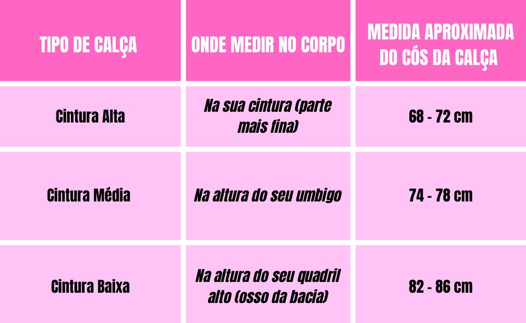 - Dica Crucial: A calça cintura baixa não fecha na sua cintura (a parte mais fina). Ela fecha no seu quadril mais alto! Por isso, a medida do cós precisa ser maior do que a medida da sua cintura para que ela sirva.